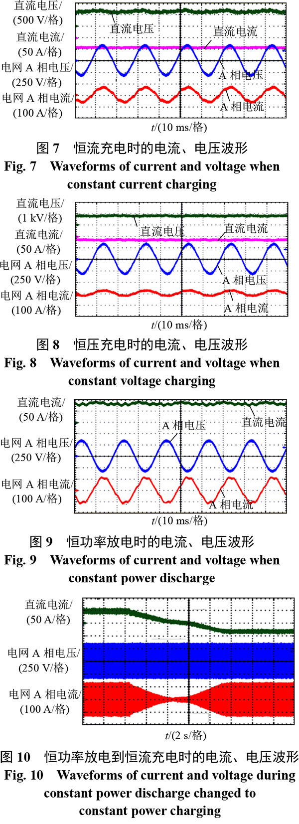 圖7為電池恒流充電時的電池直流側電壓、電流以及電網側的A相電壓和電流。圖8為電池恒壓充電時的電池直流側電壓、電流以及電網側的A相電壓、電流。圖9為恒功率放電時的電網側A相電壓和電流。圖10為恒功率放電到恒流充電時的電網側A相電壓、電流和電池直流側電流。