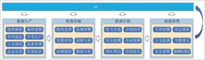 能源全產(chǎn)業(yè)鏈與AI的互相影響逐漸加深,如圖1所示。在能源生產(chǎn)環(huán)節(jié),AI技術(shù)應用于不可再生能源(煤、石油、天然氣等)地質(zhì)勘探、地質(zhì)建模過程,極大提高勘探的效率與準確性。在開采過程中,AI驅(qū)動的智能作業(yè)系統(tǒng)(設(shè)備)能夠根據(jù)實時地質(zhì)條件自動調(diào)整作業(yè)參數(shù),提高作業(yè)效率和安全性。從礦床開采全生產(chǎn)周期來看,基于AI分析的生產(chǎn)優(yōu)化模型可以通過協(xié)調(diào)調(diào)度和運營優(yōu)化,合理調(diào)配開采作業(yè)強度,優(yōu)化生產(chǎn)周期。在可再生能源生產(chǎn)方面,利用AI技術(shù)優(yōu)化選址、設(shè)備運行參數(shù)以及與其他能源形式的協(xié)同調(diào)度,在一定程度上可克服太陽能、風能等間歇性能源的不確定性,提升可再生能源在電網(wǎng)中的接入比例和穩(wěn)定性,促進能源結(jié)構(gòu)的優(yōu)化。