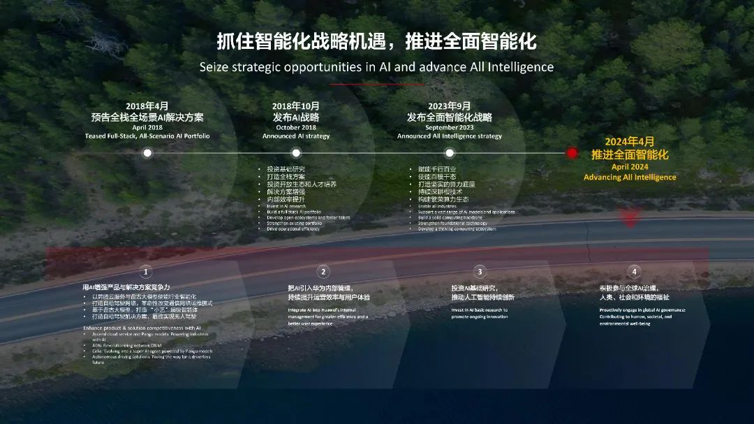 ? 第五個(gè)舉措,也是今天要重點(diǎn)闡述的,華為如何抓住智能化戰(zhàn)略機(jī)遇,推進(jìn)全面智能化。華為公司的AI戰(zhàn)略以及全棧全場景AI解決方案是在2018年4月的分析師大會(huì)向大家預(yù)告的,并在2018年10月的全聯(lián)接大會(huì)正式發(fā)布的。在2023年9月的全聯(lián)接大會(huì)上,華為進(jìn)一步發(fā)布了全面智能化的戰(zhàn)略,今天我將更具體地闡述華為如何來全面推進(jìn)智能化。