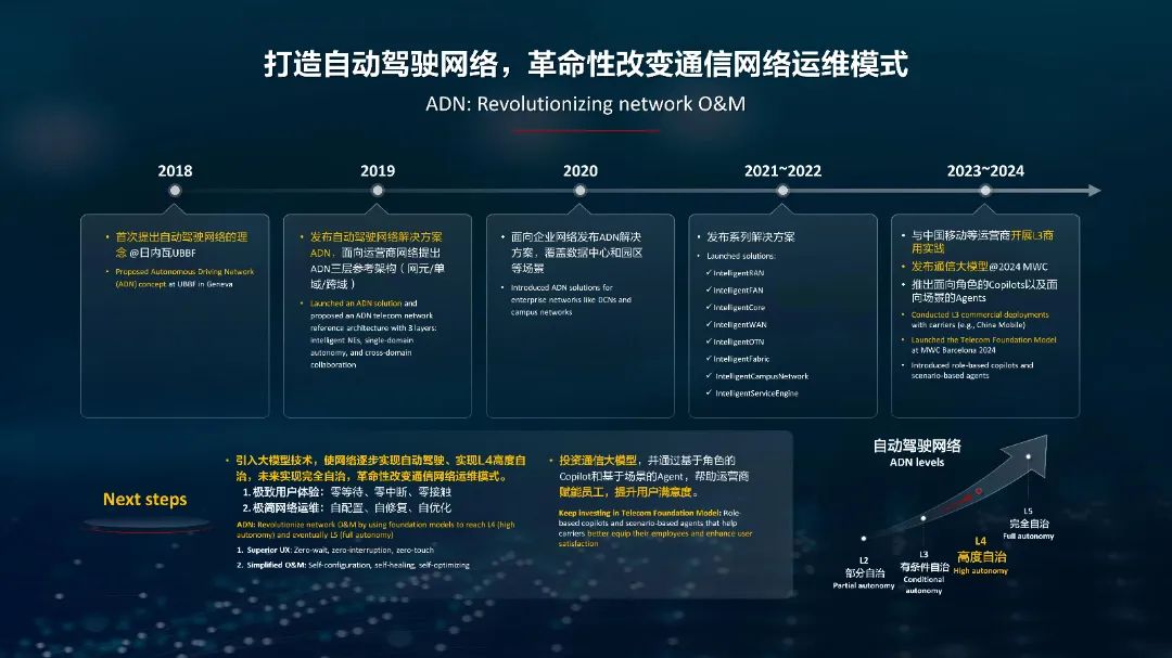 ? 打造自動(dòng)駕駛網(wǎng)絡(luò),革命性改變通信網(wǎng)絡(luò)運(yùn)維模式。電信運(yùn)營商網(wǎng)絡(luò)運(yùn)維是非常復(fù)雜的,因此成本也非常高。因此在2018年的日內(nèi)瓦UBBF,華為參考汽車自動(dòng)駕駛的分級(jí)理念提出了自動(dòng)駕駛網(wǎng)絡(luò)的概念,也就是ADN(Autonomous Driving Network)。經(jīng)過這么多年和電信運(yùn)營商持續(xù)的探討、聯(lián)合創(chuàng)新,形成了大量的ADN解決方案,到今天,ADN已經(jīng)成為網(wǎng)絡(luò)運(yùn)維智能化轉(zhuǎn)型的戰(zhàn)略共識(shí)。而大模型出來以后,自動(dòng)駕駛網(wǎng)絡(luò)的目標(biāo)更加具有現(xiàn)實(shí)意義了,運(yùn)營商都希望自己的網(wǎng)絡(luò)能夠盡快實(shí)現(xiàn)自動(dòng)駕駛、實(shí)現(xiàn)L4高度自治,未來實(shí)現(xiàn)完全自治,帶來以“零等待、零中斷、零接觸”為標(biāo)志的極致的用戶體驗(yàn),和以“自配置、自修復(fù)、自優(yōu)化”為標(biāo)志的極簡的網(wǎng)絡(luò)運(yùn)維。華為將與中國及全球運(yùn)營商合作打造通信大模型,并首先通過基于角色的Copilot和基于場景的Agent,幫助運(yùn)營商賦能員工,提升用戶滿意度,讓運(yùn)營商盡快因大模型技術(shù)和自動(dòng)駕駛網(wǎng)絡(luò)而獲益。