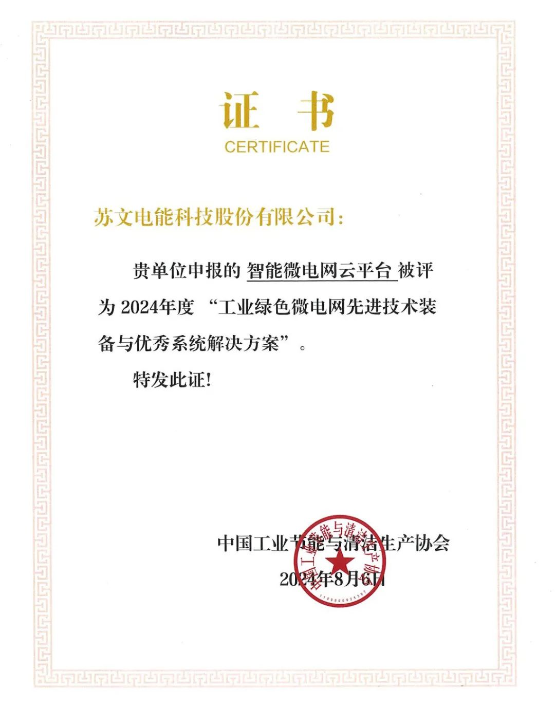 8月17日,由中國工業(yè)節(jié)能與清潔生產(chǎn)協(xié)會主辦的“2024工業(yè)綜合能效大會”順利召開,蘇文電能(300982)電能俠智能微電網(wǎng)云平臺被授予“工業(yè)綠色微電網(wǎng)先進技術(shù)裝備與優(yōu)秀系統(tǒng)解決方案”大獎,這一榮譽標(biāo)志著,蘇文電能在工業(yè)節(jié)能環(huán)保領(lǐng)域所作出的突出貢獻。