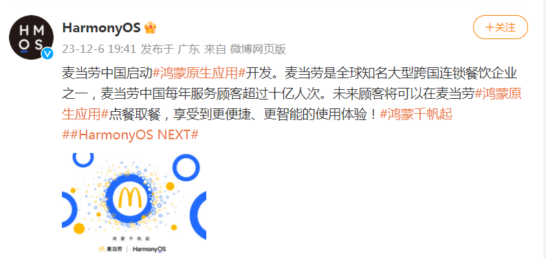 余承東在2023年8月4日的華為開發(fā)者大會(huì)上表示,自2019年HarmonyOS問(wèn)世以來(lái),憑借簡(jiǎn)潔、流暢、安全的體驗(yàn)受到大家喜愛,鴻蒙生態(tài)的設(shè)備數(shù)量已超過(guò)7億 。頭部互聯(lián)網(wǎng)應(yīng)用紛紛加入,掀起了鴻蒙千帆起的開發(fā)熱潮。華為數(shù)據(jù)顯示,截至目前,國(guó)內(nèi)200家頭部應(yīng)用廠商中,超百家已啟動(dòng)鴻蒙原生應(yīng)用開發(fā),包括來(lái)自各行各業(yè)的代表企業(yè)。據(jù)了解,目前,麥當(dāng)勞、美團(tuán)、去哪兒、新浪、釘釘、螞蟻集團(tuán)、小紅書、58集團(tuán)、嗶哩嗶哩、高德地圖等已啟動(dòng)鴻蒙原生應(yīng)用開發(fā)。