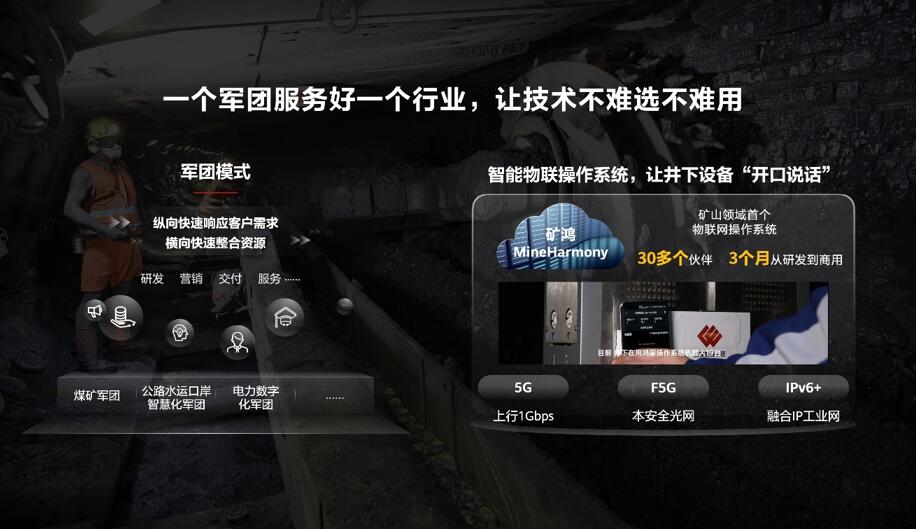 為了幫助企業(yè)選好技術、用好技術,另一個關鍵措施就是成立軍團。自去年底,我們已面向煤礦、港口、電力等多個行業(yè)成立了多個軍團組織。軍團是專業(yè)化隊伍,一方面,對內(nèi)拉通端到端的資源,包括研發(fā)、銷售、交付、服務等,以便深入理解行業(yè)的生產(chǎn)實踐和行業(yè)知識,打造適配場景的產(chǎn)品和解決方案;另一方面,對外聯(lián)合更多的解決方案伙伴,把華為和伙伴的能力整合在一起,形成針對性的解決方案。