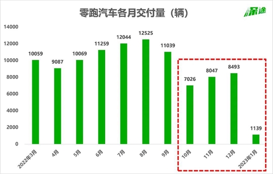 比較讓人意外的是零跑。1月只交付了1139輛,而去年12月是8493輛,環(huán)比下跌幅度達(dá)到87%。零跑現(xiàn)在是明顯的后勁不足,去年有連續(xù)5個(gè)月交付過萬,從10月開始掉到七八千的水平。1月的成績用“撲街”來形容再合適不過了。