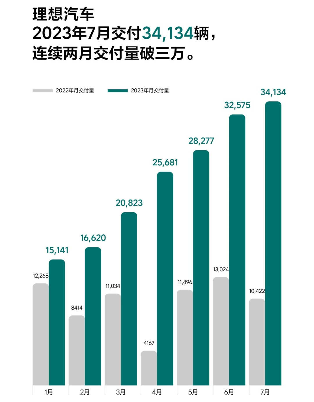 7月,理想汽車共交付34134輛,同比增長(zhǎng)227.5%、環(huán)比增長(zhǎng)4.8%。