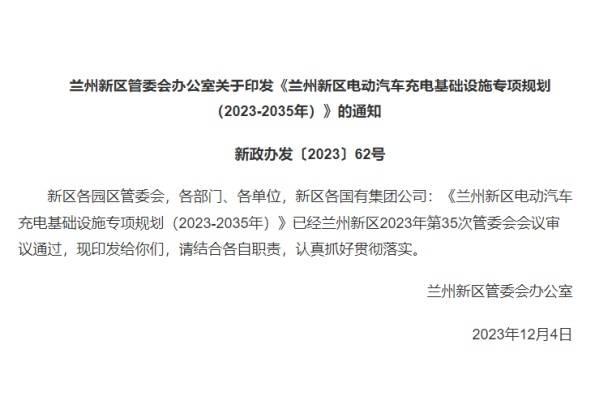 12月18日,蘭州新區(qū)管委會(huì)發(fā)布《蘭州新區(qū)電動(dòng)汽車充電基礎(chǔ)設(shè)施專項(xiàng)規(guī)劃(2023-2035年)》。