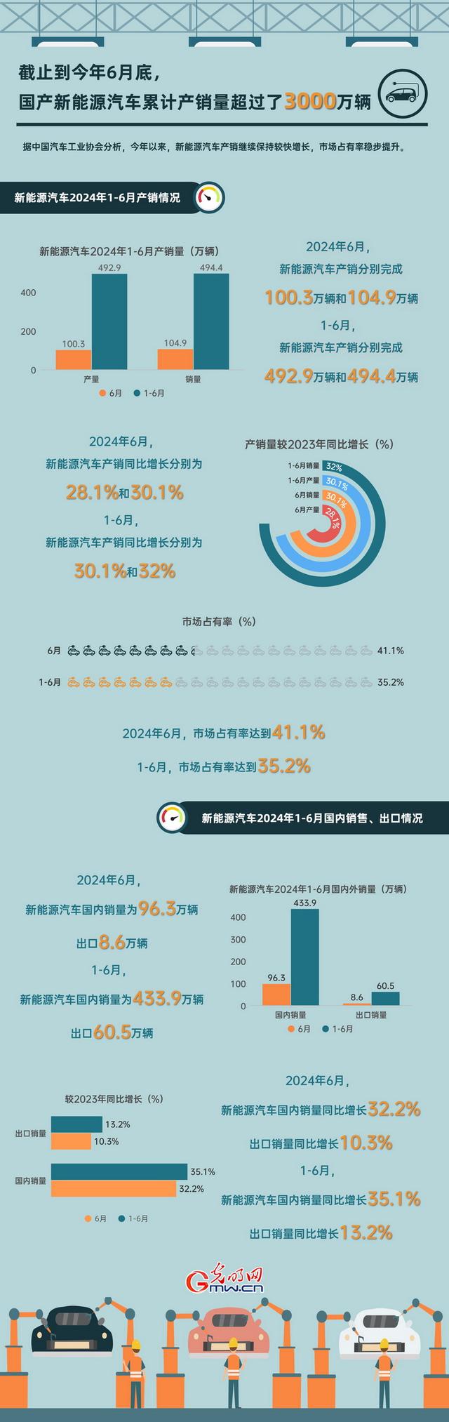 據中國汽車工業(yè)協(xié)會發(fā)布的數據顯示,2024年6月,新能源汽車產銷分別完成100.3萬輛和104.9萬輛,同比分別增長28.1%和30.1%,市場占有率達到41.1%。1-6月,新能源汽車產銷分別完成492.9萬輛和494.4萬輛,同比分別增長30.1%和32%,市場占有率達到35.2%。