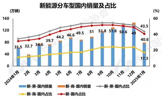 中汽協(xié)最新數(shù)據(jù)顯示,2025年1月,新能源乘用車國內(nèi)銷量占乘用車國內(nèi)銷量比例為43.5%,這一比例已經(jīng)連續(xù)4個月環(huán)比下跌,也是在去年9月達(dá)到最高點(diǎn)后,第二個月跌至50%以下。去年9月,國內(nèi)新能源乘用車滲透率達(dá)到歷史最高點(diǎn),為54.5%。