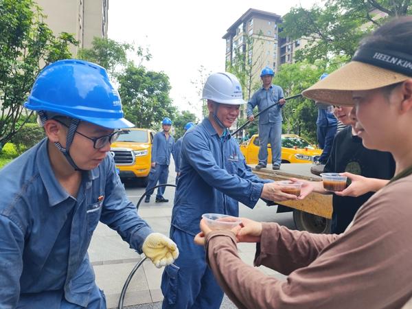 6月22日,桂林市萬(wàn)達(dá)翰林府小區(qū)群眾為正在開(kāi)展搶修復(fù)電的南方電網(wǎng)廣西欽州靈山供電局黨員突擊隊(duì)員們送上綠豆湯。陳心誠(chéng)攝