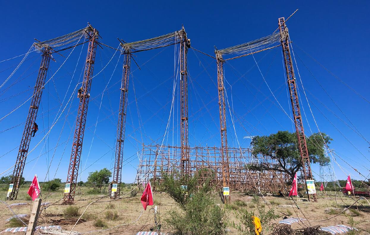 在跨越點位置,兩條單回路走向與桑錫鐵路的交叉角度分別為62°、63°,交叉角度大,施工相對困難。項目部根據(jù)現(xiàn)場實地勘察,并結(jié)合以往跨越鐵路施工經(jīng)驗,采用了“在桑錫鐵路網(wǎng)圍欄兩側(cè)搭設(shè)獨立抱桿跨越架,在跨越架之間用絕緣桿封網(wǎng)”的方式進行跨越施工。為保障跨越施工順利完成,送變電公司配備精兵強將,項目部提早完成跨越手續(xù)辦理。班組負責(zé)人、防護員、安全員、技術(shù)員、駐站聯(lián)絡(luò)員等全程到崗到位。經(jīng)過13天精心準(zhǔn)備,牽張場地布置、跨越架和防護架搭設(shè)、各種工器具和導(dǎo)地線及光纜進場等各項準(zhǔn)備工作全部就緒。