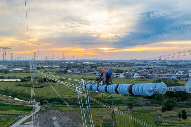 圖為該工程竣工前夕,電力建設(shè)工人正在進行最后的附件安裝工作。