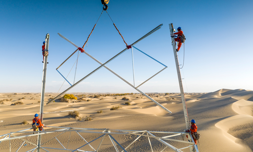 近日,山東送變電工程有限公司施工人員開展新疆750千伏且末—若羌輸電線路工程Ⅱ標(biāo)段鐵塔組立作業(yè)。該標(biāo)段線路長110.85千米,全線位于塔克拉瑪干沙漠,共計新建鐵塔225基。