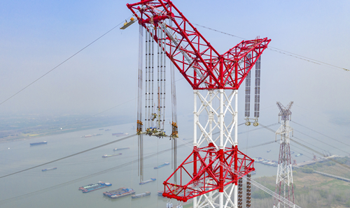 對于白鶴灘—江蘇工程安徽段的建設(shè)者來說,讓導(dǎo)線順利跨越2500米寬的長江蕪湖段,無疑是最大挑戰(zhàn)。為了保證導(dǎo)線與江面的安全距離,兩岸主跨越塔設(shè)計高度達278.2米、接近100層樓高,重量達2200多噸,這是全線路跨度最大、塔身最高、單基最重的跨越塔。安徽段長江大跨越施工隊隊長韓仲瑞介紹:“僅與塔腿段連接的單根塔管就重17噸,連接處由26個螺栓固定,每個螺栓重35斤,這樣的螺栓全塔大概需要2000個,都必須嚴(yán)絲合縫地對接上。”