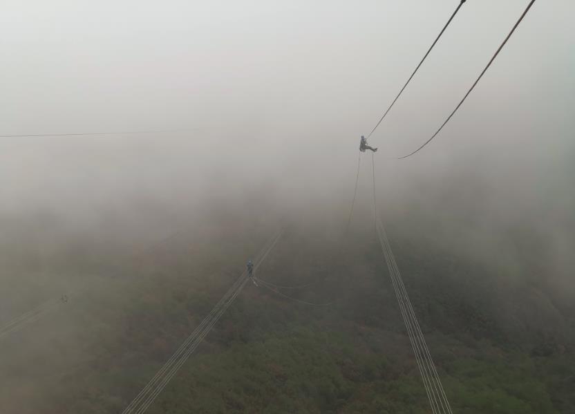 寒潮前夕,南方電網(wǎng)超高壓公司柳州局輸電所檢修人員頂著寒風(fēng)在架空地線上懸空開展500千伏桂山乙線55#大號側(cè)架空地線復(fù)合光纜補(bǔ)強(qiáng)工作,確保在即將到來的雨雪冰凍天氣中覆冰監(jiān)測裝置及整條線路保持安全運(yùn)行。