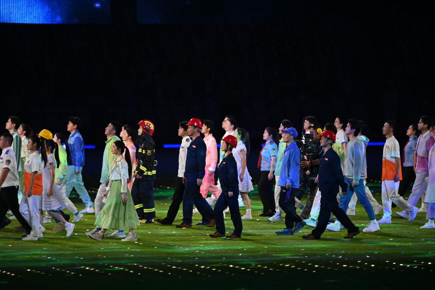 ▲國(guó)家電網(wǎng)員工來到閉幕式舞臺(tái)中央。新華社記者 黃宗治 攝