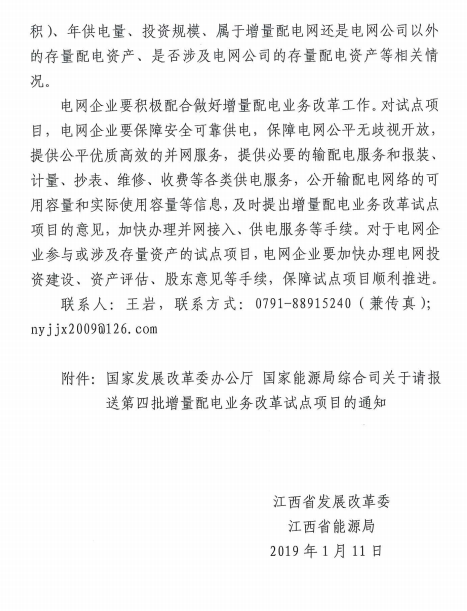 江西省發(fā)改委、江西省能源局日前聯(lián)合發(fā)布了《關(guān)于報送第四批增量配電業(yè)務(wù)改革試點(diǎn)項(xiàng)目的通知》,要求各地要結(jié)合工作實(shí)際情況,認(rèn)真總結(jié)前三批試點(diǎn)經(jīng)驗(yàn),按照國家相關(guān)要求盡快篩選符合條件的第四批試點(diǎn)項(xiàng)目,試點(diǎn)項(xiàng)目應(yīng)符合省級電網(wǎng)規(guī)劃。強(qiáng)調(diào)電網(wǎng)企業(yè)要積極配合做好增量配電業(yè)務(wù)改革工作。對試點(diǎn)項(xiàng)目,電網(wǎng)企業(yè)要保障安全可靠供電,保障電網(wǎng)公平無歧視開放, 提供公平優(yōu)質(zhì)高效的并網(wǎng)服務(wù),提供必要的輸配電服務(wù)和報裝、 計量、抄表、維修、收費(fèi)等各類供電服務(wù),公開輸配電網(wǎng)絡(luò)的可 用容量和實(shí)際使用容量等信息,及時提出增量配電業(yè)務(wù)改革試點(diǎn)項(xiàng)目的意見,加快辦理并網(wǎng)接入、供電服務(wù)等手續(xù)。
