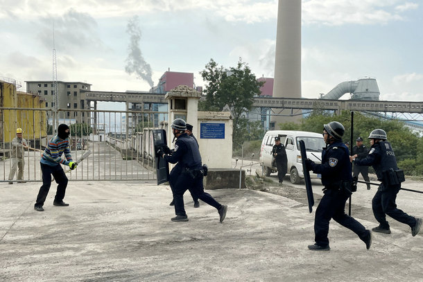 按照演習方案,兩名“假想嫌疑人”持器械翻越生產區(qū)域3號門,企圖闖入油泵房破壞生產設施。生產值班人員發(fā)現(xiàn)歹徒欲行闖入,立即上報,同時進行攔截。該公司應急辦迅速啟動應急預案,并向公安機關報警,要求出警支援。接到報警后,鎮(zhèn)派出所快速組織警力趕到事發(fā)現(xiàn)場,幾經周旋,與公司內保人員一起將“恐怖分子”控制抓捕。演練過程中,該公司各個部門反映迅速,配合默契,采取處置措施及時、合理、表現(xiàn)出良好的處理突發(fā)事件的能力。