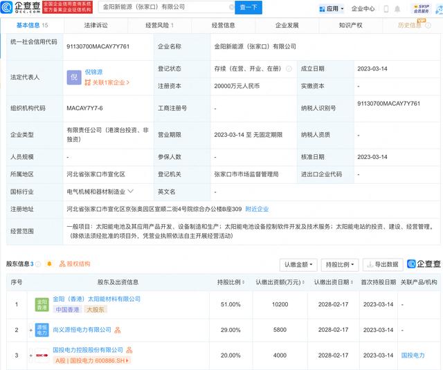 企查查APP顯示,近日,金陽(yáng)新能源(張家口)有限公司成立,法定代表人為倪錦源,注冊(cè)資本2億元人民幣,經(jīng)營(yíng)范圍包含:太陽(yáng)能電池及其應(yīng)用產(chǎn)品開發(fā)、設(shè)備制造和生產(chǎn);太陽(yáng)能電池設(shè)備控制軟件開發(fā)及技術(shù)服務(wù);太陽(yáng)能電站的投資、建設(shè)、經(jīng)營(yíng)管理。企查查股權(quán)穿透顯示,該公司由國(guó)投電力等共同持股。