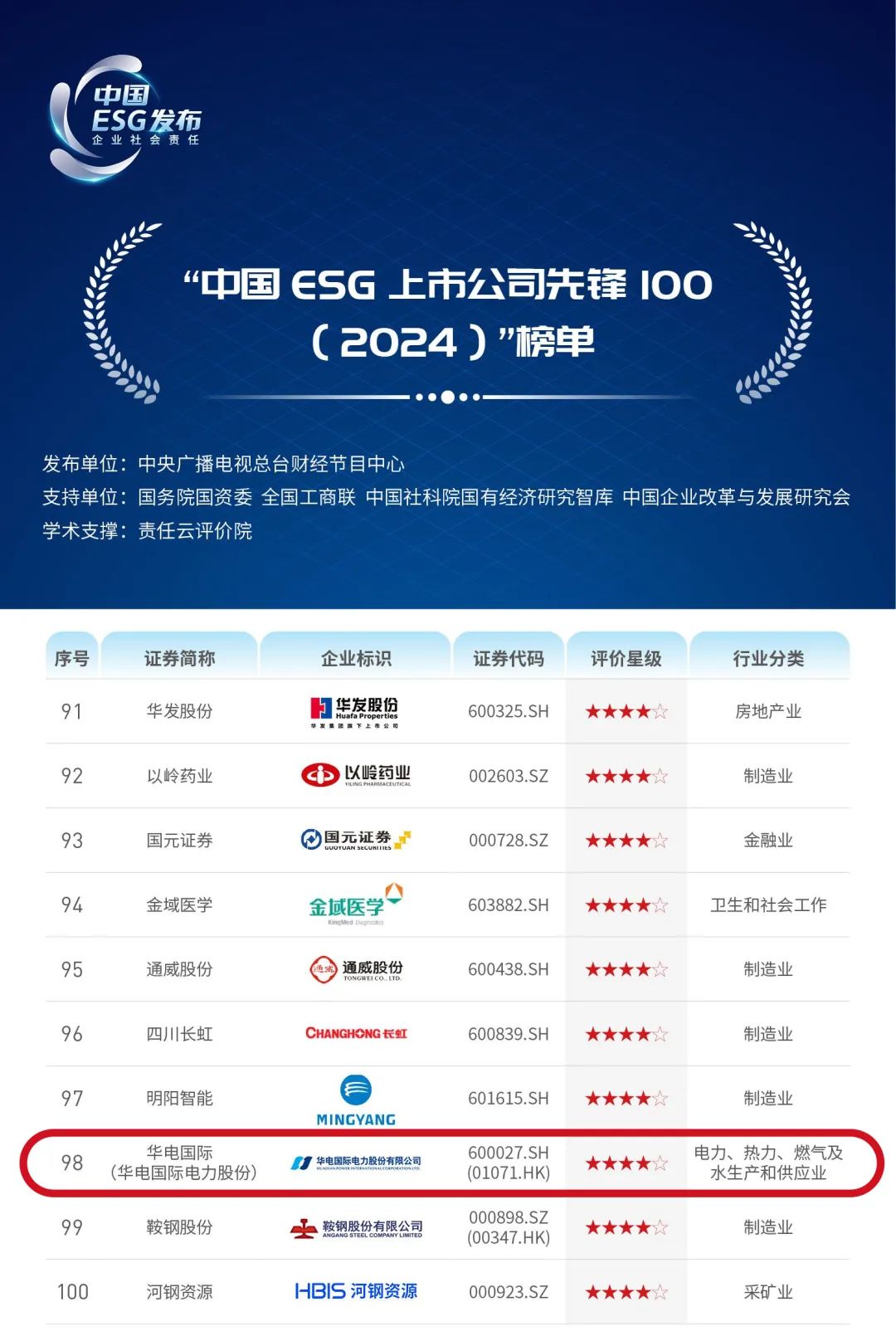 6月30日下午,中央廣播電視總臺(tái)財(cái)經(jīng)節(jié)目中心聯(lián)合國務(wù)院國資委、全國工商聯(lián)、中國社科院國有經(jīng)濟(jì)研究智庫、中國企業(yè)改革與發(fā)展研究會(huì)在京正式發(fā)布“中國ESG(企業(yè)社會(huì)責(zé)任)《2024年度ESG行動(dòng)報(bào)告》”?!秷?bào)告》公布了“中國ESG上市公司先鋒100”榜單,中國華電所屬華電國際電力股份有限公司成功入圍。
