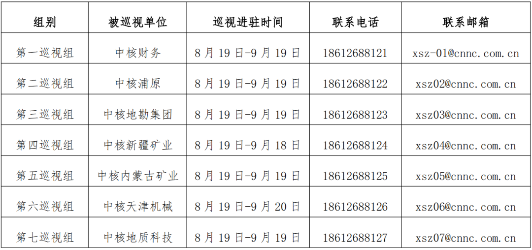 根據(jù)中核集團(tuán)黨組巡視工作統(tǒng)一部署,8月19日,黨組第一至第七巡視組分別進(jìn)駐中核財務(wù)有限責(zé)任公司、上海中核浦原有限公司、中核地質(zhì)勘查集團(tuán)有限公司、中核新疆礦業(yè)有限公司、中核內(nèi)蒙古礦業(yè)有限公司、中核(天津)機械有限公司、中核地質(zhì)科技有限公司等7家單位并召開巡視工作動員會。