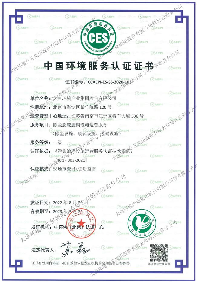 大唐環(huán)境特許經(jīng)營(yíng)分公司獲得“一級(jí)除塵脫硫脫硝設(shè)施運(yùn)營(yíng)服務(wù)”認(rèn)證
