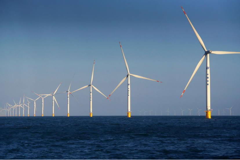 三月中旬,黃海之濱,海風凜冽。從山東海陽港碼頭出發(fā),海上航行兩個半小時后,就看見在蔚藍遼闊的海天之間,一臺臺百米高的白色“大風車”列陣迎風旋舞,不遠處,白藍相間印有華能標識的海上升壓站分外吸睛。