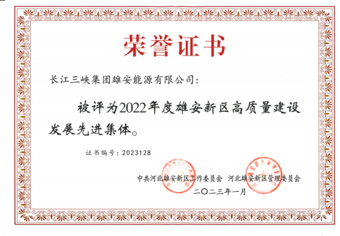 三峽雄安公司獲“2022年度雄安新區(qū)高質(zhì)量建設(shè)發(fā)展先進(jìn)集體”稱號