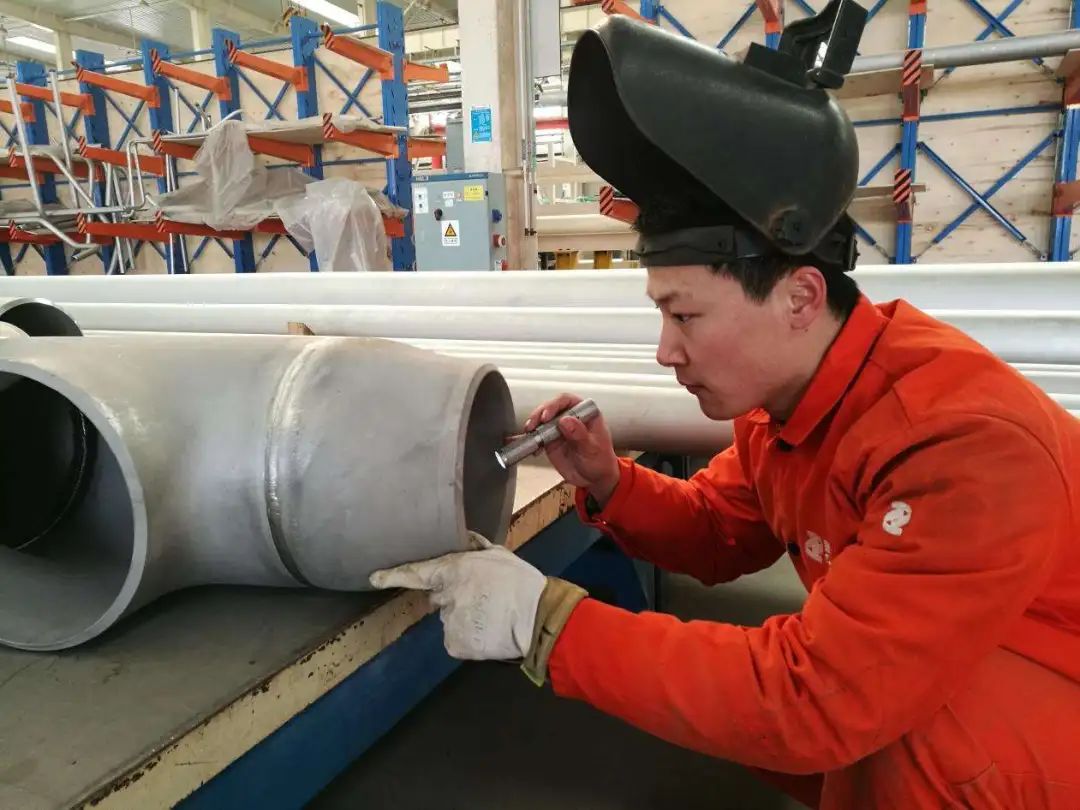 豆存印正在檢查焊縫。但對豆存印來說,他的焊接合格率早已實現(xiàn)100%,出于嚴謹性考慮,焊接完成后他還會用肉眼再檢查一遍焊縫是否合格,以確保沒有任何細微的瑕疵遺漏。