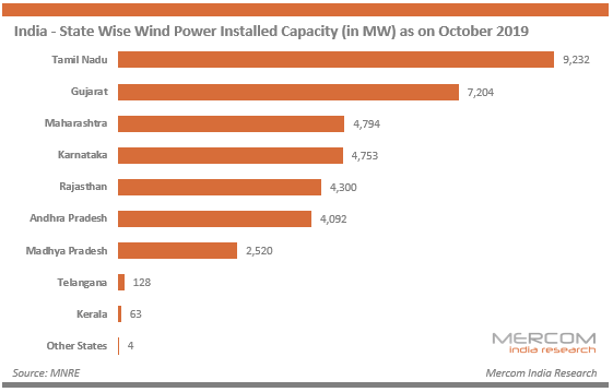 政府設(shè)定了到2022年安裝60 GW風(fēng)力發(fā)電能力的目標(biāo)。根據(jù)MNRE,印度的累計風(fēng)力發(fā)電安裝量已突破37 GW大關(guān),到2019年10月為37,090.03 MW。