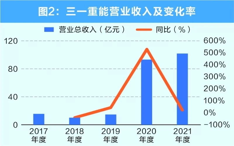 得益于風電行業(yè)整體的快速發(fā)展,以及公司自身產品的逐步成熟,及補貼退坡前的風電搶裝潮驅動,三一重能業(yè)務規(guī)模呈現(xiàn)跨越式發(fā)展。2019年至2021年,三一重能分別實現(xiàn)營業(yè)收入14.81億元、93.11億元和101.75億元,同比增長43.14%、528.57%和9.28%(見圖)。
