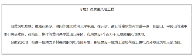 積極推進(jìn)集中式風(fēng)電規(guī)?;_發(fā)。堅(jiān)持生態(tài)環(huán)境優(yōu)先,錨定新增靈活調(diào)節(jié)能力和用電負(fù)荷增長,根據(jù)風(fēng)能資源分布規(guī)律,加快風(fēng)能資源規(guī)?;_發(fā)利用。在京廣鐵路以西及大別山區(qū)域優(yōu)先采用風(fēng)電與傳統(tǒng)電源、抽水蓄能電站一體化開發(fā)模式,打造一批多能互補(bǔ)示范項(xiàng)目;在京廣鐵路以東平原區(qū)域,支持風(fēng)能就近開發(fā)就地消納??茖W(xué)布局沿黃綠色能源廊道,做好水土保持、生態(tài)修復(fù)和林地恢復(fù),以沿黃淺山丘陵和中東部平原地區(qū)為重點(diǎn),加快建設(shè)4個(gè)百萬千瓦高質(zhì)量風(fēng)電基地。