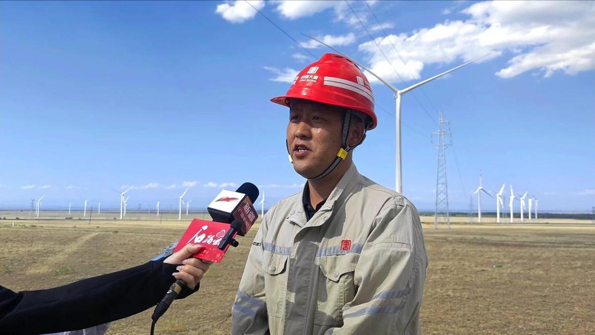 圖:大唐托里縣清潔能源有限公司老風(fēng)口風(fēng)電項目副經(jīng)理祁景華介紹風(fēng)力發(fā)電項目進展