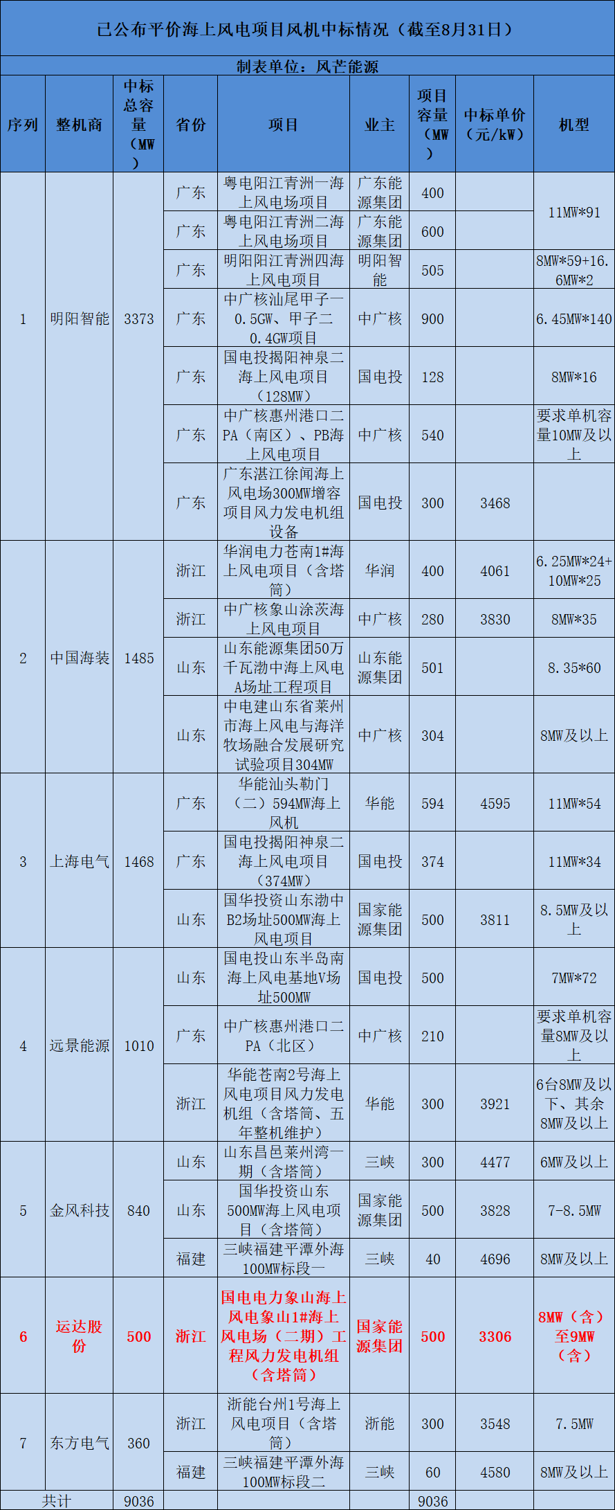 8月30日,國家能源集團國電電力象山海上風電象山1#海上風電場(二期)工程500MW風機采購(含塔筒)中標候選公示。