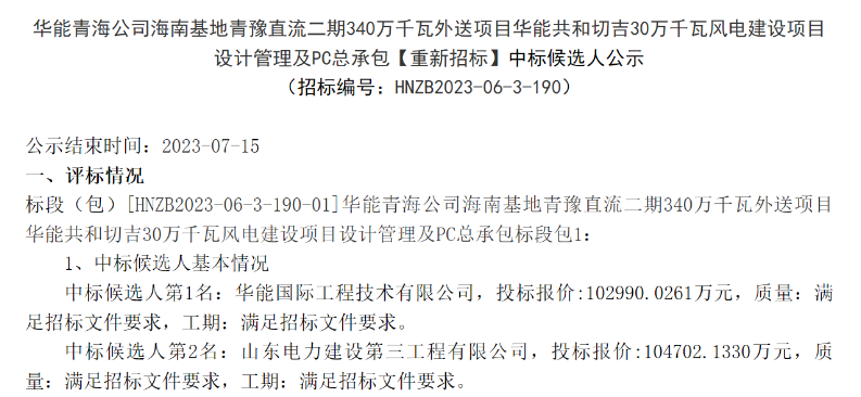 公告顯示,第一中標(biāo)候選人:華能國(guó)際工程技術(shù)有限公司,投標(biāo)報(bào)價(jià):102990.0261萬(wàn)元。第二中標(biāo)候選人:山東電力建設(shè)第三工程有限公司,投標(biāo)報(bào)價(jià):104702.1330萬(wàn)元。第三中標(biāo)候選人:中國(guó)電建集團(tuán)山東電力建設(shè)第一工程有限公司,投標(biāo)報(bào)價(jià):109934.0179萬(wàn)元。