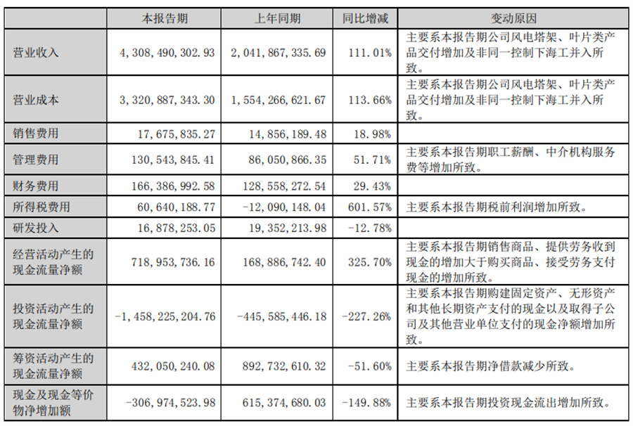 (二)主要產(chǎn)品及用途 報(bào)告期內(nèi),公司主要產(chǎn)品為風(fēng)力發(fā)電用風(fēng)機(jī)塔架(含海上風(fēng)機(jī)塔架及單樁)、錨栓以及新能源發(fā)電 業(yè)務(wù)。風(fēng)力發(fā)電設(shè)備通常包含風(fēng)電機(jī)組、風(fēng)電支撐基礎(chǔ)以及輸電控制系統(tǒng)三大部分,公司所生產(chǎn)風(fēng)機(jī)塔 筒及單樁為風(fēng)電設(shè)備支撐系統(tǒng)的重要組成部分。公司新能源發(fā)電業(yè)務(wù)為風(fēng)力發(fā)電場(chǎng)和光伏電站的運(yùn)營(yíng), 其工作原理是將風(fēng)能、光能轉(zhuǎn)化為電能,通過(guò)升壓變電站升壓后輸送至電網(wǎng),完成發(fā)電銷售。