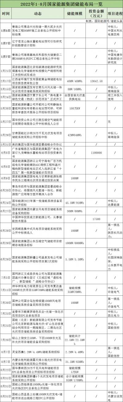 據(jù)不完全統(tǒng)計,2022年1-8月,國家電投與寧德時代、中國電建、中國天楹等簽訂合作協(xié)議,圍繞儲能材料、風光氫儲、重力儲能等方面進行合作。儲能項目招標26個,涉及飛輪儲能、液流電池、鉛炭電池、抽水蓄能及智慧新能源等方面。