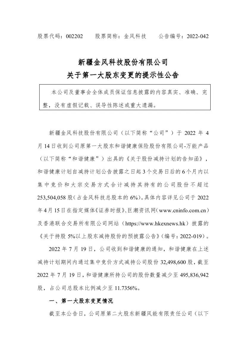 金風科技日前發(fā)布《關(guān)于第一大股東變更的提示性公告》。截至2022年7月19日,公司原第一大股東和諧健康保險股份有限公司-萬能產(chǎn)品(簡稱“和諧健康”)所持公司的股份數(shù)量占總股本比例減少至11.7356%,原第二大股東新疆風能有限責任公司(簡稱“風能公司”)被動成為公司的第一大股東。