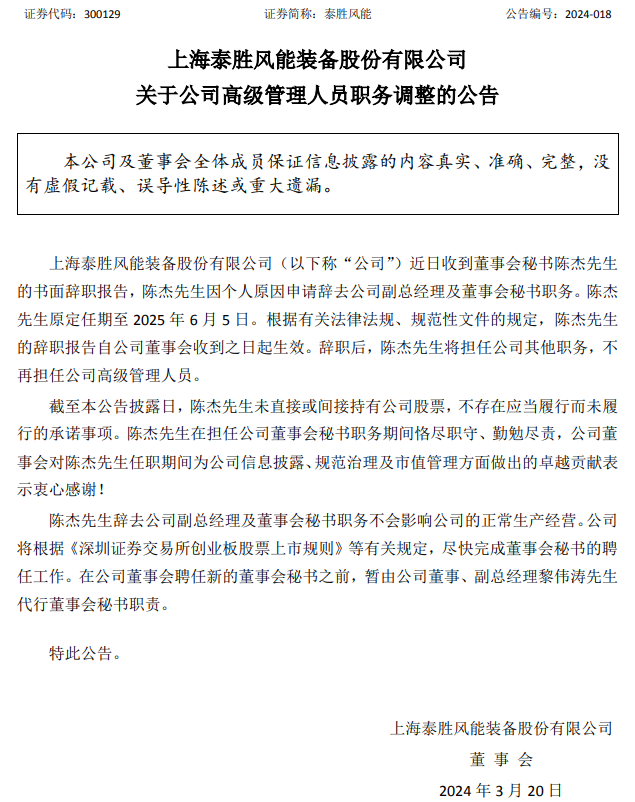 3月20日,上海泰勝風(fēng)能裝備股份有限公司(簡(jiǎn)稱(chēng):泰勝風(fēng)能)發(fā)布關(guān)于公司高級(jí)管理人員職務(wù)調(diào)整的公告。