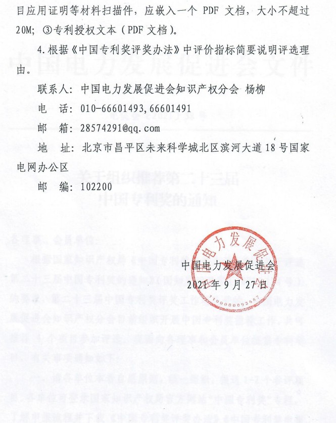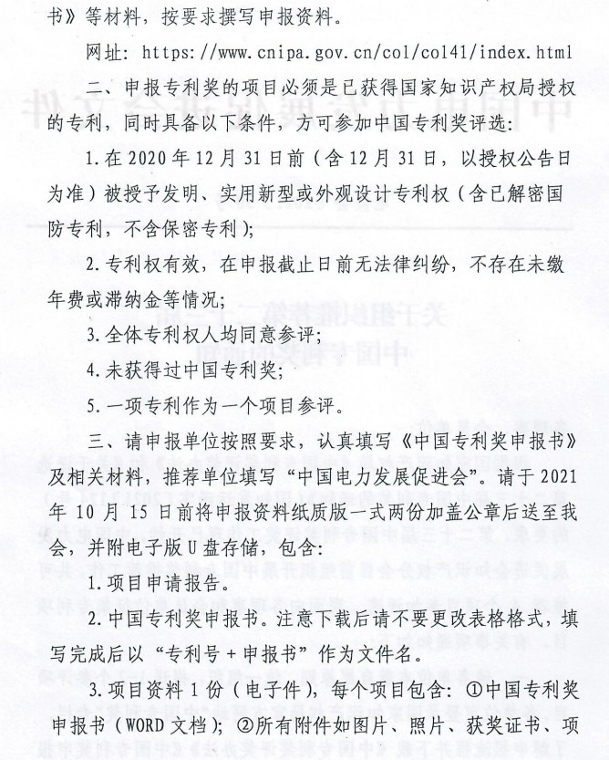 三、請申報單位按照要求,認真填寫《中國專利獎申報書》及相關材料,推薦單位填寫“中國電力發(fā)展促進會”。請于2021年10月15日前將申報資料紙質(zhì)版一式兩份加蓋公章后送至我會,并附電子版U盤存儲,包含: