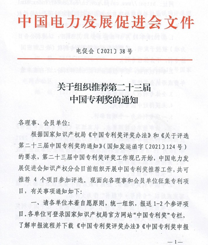 根據(jù)國家知識產(chǎn)權局《中國專利獎評獎辦法》和《關于評選第二十三屆中國專利獎的通知》(國知發(fā)運函字〔2021〕124號)的要求,第二十三屆中國專利獎評獎工作現(xiàn)已開始,中國電力發(fā)展促進會知識產(chǎn)權分會目前組織開展中國專利獎推薦工作,共可推薦4個項目參加評選?,F(xiàn)面向各理事和會員單位征集專利項目,有關事項通知如下: