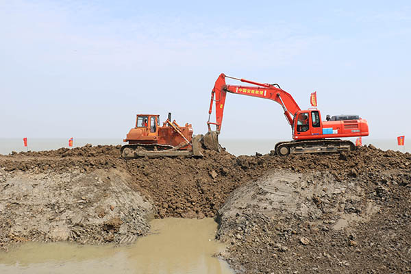 作為應(yīng)急救援的“國(guó)家隊(duì)”,常州分公司搶險(xiǎn)隊(duì)員用鮮紅的“安能色彩”點(diǎn)亮演練現(xiàn)場(chǎng),隨著現(xiàn)場(chǎng)指揮員一聲令下,參演人員裝備迅速到達(dá)任務(wù)區(qū)域。針對(duì)決口險(xiǎn)情,搶險(xiǎn)分隊(duì)出動(dòng)挖掘機(jī)、推土機(jī)、自卸車等重型裝備,采用“機(jī)械化立體封堵”戰(zhàn)法,按“穩(wěn)固堤頭、單戧立堵、雙向進(jìn)占、防滲閉氣”的步驟穩(wěn)步實(shí)施,同時(shí)救援編隊(duì)根據(jù)決口實(shí)際科學(xué)編配機(jī)械、合理編組人員,將裝料、運(yùn)料、推料工作分層次合理劃分,并根據(jù)機(jī)械編組采取“311”模式配備指揮員、觀察員、安全員,全程保證人員安全和指揮精準(zhǔn)高效,圓滿完成決口封堵演練任務(wù)。針對(duì)堤防迎水面滑坡險(xiǎn)情,采用挖掘機(jī)植樁固腳的方式進(jìn)行搶護(hù),以“上部削坡、下部固腳”為原則,充分發(fā)揮重型機(jī)械快捷高效的特點(diǎn),高標(biāo)準(zhǔn)完成工程搶險(xiǎn)任務(wù)。