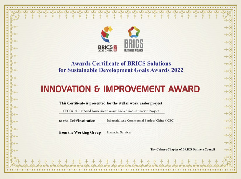 近日,在“2022年金磚國(guó)家可持續(xù)發(fā)展目標(biāo)解決方案大賽”中,中國(guó)能建所屬投資公司發(fā)行的“工銀瑞投-中能建投風(fēng)電綠色資產(chǎn)支持專項(xiàng)計(jì)劃”(以下簡(jiǎn)稱“中能建投類REITs”)榮獲創(chuàng)新進(jìn)步獎(jiǎng)。