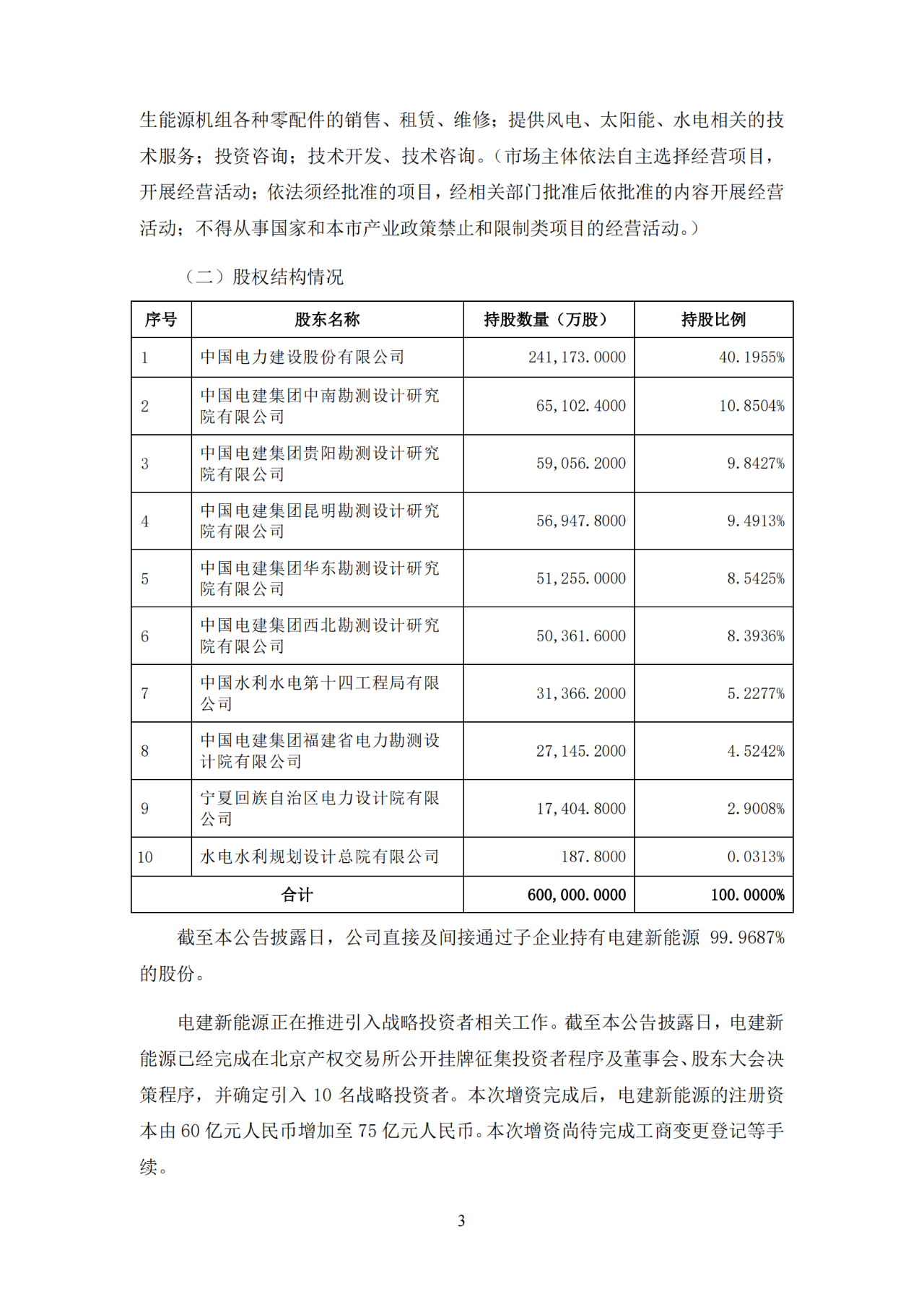 目前,電建新能源正在推進(jìn)引入戰(zhàn)略投資者相關(guān)工作。截至本公告披露日,電建新能源已經(jīng)完成在北京產(chǎn)權(quán)交易所公開(kāi)掛牌征集投資者程序及董事會(huì)、股東大會(huì)決策程序,并確定引入10名戰(zhàn)略投資者。本次增資完成后,電建新能源的注冊(cè)資本由60億元人民幣增加至75億元人民幣。