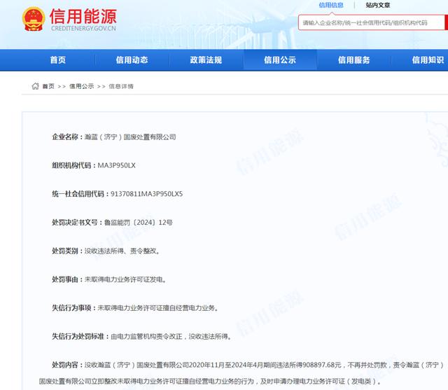 未取得電力業(yè)務(wù)許可證發(fā)電,瀚藍(lán)(濟(jì)寧)固廢處置有限公司被罰