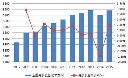 過去10年間,隨著人口增長,城市建設(shè)以及經(jīng)濟(jì)增長,全國用水總量總體呈現(xiàn)持續(xù)增長態(tài)勢,在2015年達(dá)到6180億立方米。(其中,由于首次進(jìn)行最嚴(yán)格水資源管理制度考核、以及農(nóng)業(yè)水價綜合改革和工業(yè)用水差別水價政策的推進(jìn),2014年的農(nóng)業(yè)和工業(yè)用水量分別出現(xiàn)下降,全國用水總量同時環(huán)比下降1.4%。)05至15年的用水總量年均復(fù)合增長率約為0.93%,據(jù)此計算到2030年全國用水總量將達(dá)到7100億立方米。這一預(yù)測與《全國水資源綜合規(guī)劃》劃定的2030年用水上限不超過7000億立方米基本一致。因此,在可預(yù)見的未來,用水量仍將繼續(xù)增長。
