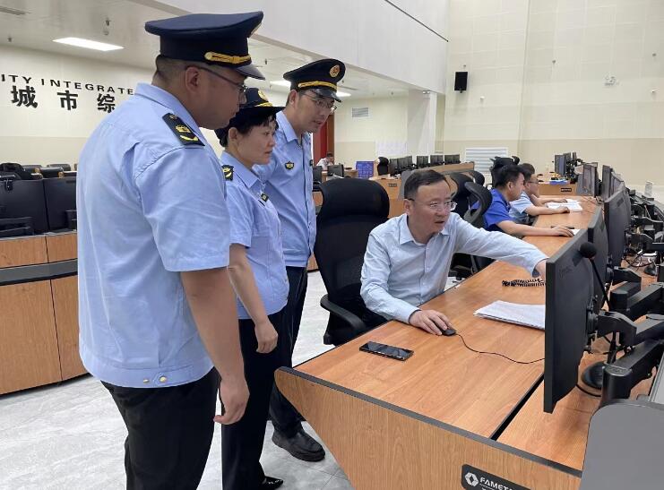 圖為雙碳數(shù)字化平臺(tái)工程師為執(zhí)法人員講解指揮中心的各項(xiàng)功能。 胡義 攝