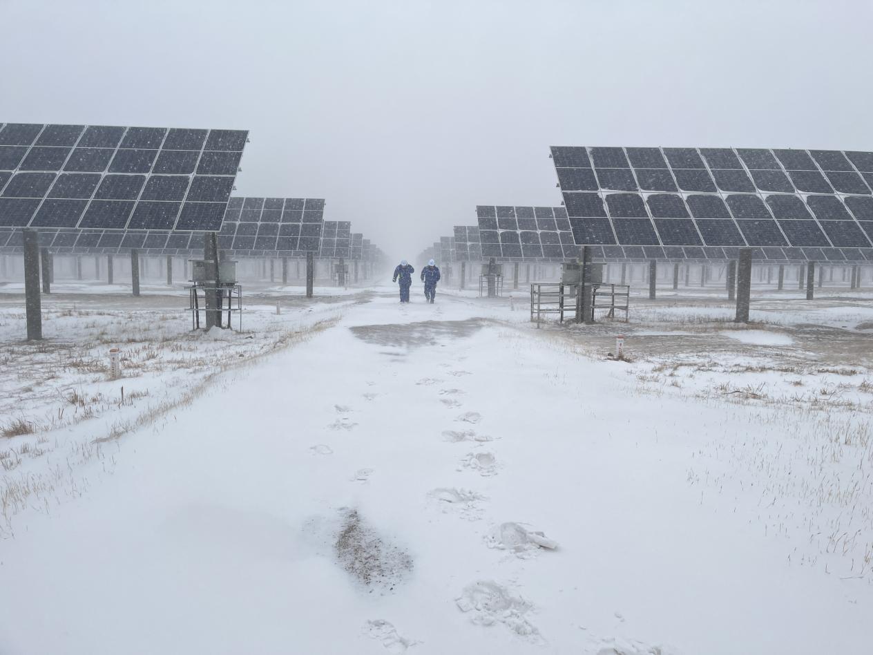 中國(guó)節(jié)能所屬太陽(yáng)能新疆區(qū)白城領(lǐng)跑者電站運(yùn)維人員冒雪巡檢線(xiàn)路