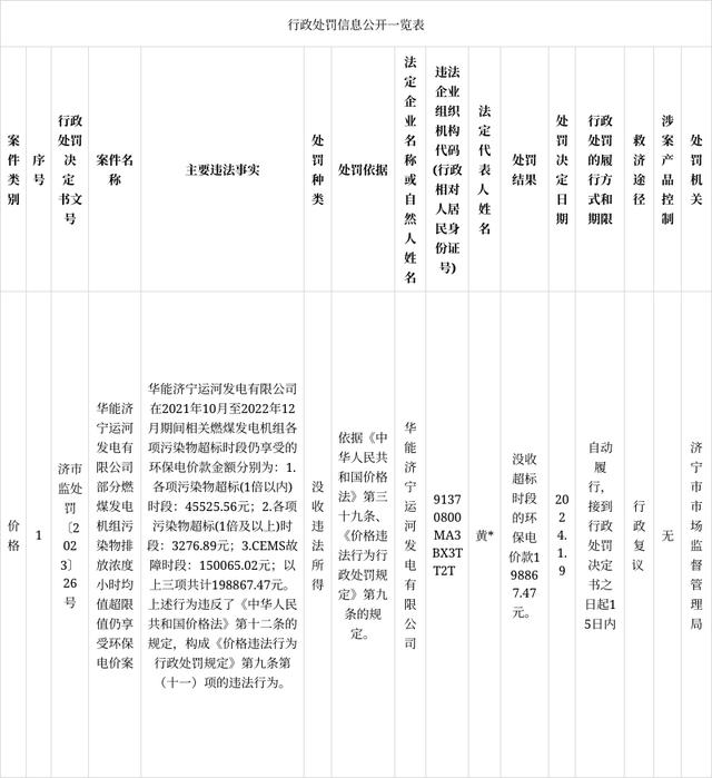 山東濟(jì)寧市市場(chǎng)監(jiān)督管理局近日對(duì)華能濟(jì)寧運(yùn)河發(fā)電有限公司部分燃煤發(fā)電機(jī)組污染物排放濃度小時(shí)均值超限值仍享受環(huán)保電價(jià)依法作出沒收超標(biāo)時(shí)段的環(huán)保電價(jià)款198867.47元的行政處罰,信息如下表: