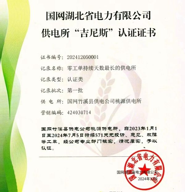 中國電力網(wǎng)訊(通訊員 黃耀成、郭旭) 日前,從國網(wǎng)湖北省電力有限公司傳來喜訊,繼去年國網(wǎng)竹溪縣供電公司匯灣供電所喜獲國網(wǎng)十堰供電公司“四星級鄉(xiāng)鎮(zhèn)供電所”授牌后,今年國網(wǎng)竹溪縣供電公司桃源供電所又獲國網(wǎng)湖北省電力有限公司頒發(fā)的零工單位持續(xù)天數(shù)最長的供電所“吉尼斯”認證證書,這是該公司強化從業(yè)紀律,擦亮服務窗口,電業(yè)清風為民的真實寫照。