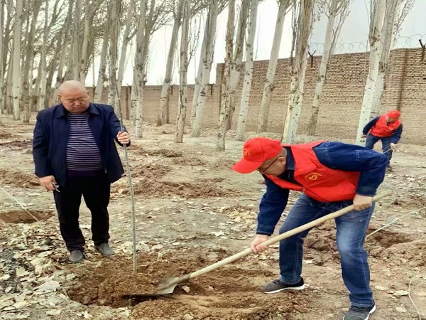 上午十點(diǎn),春風(fēng)送爽,天氣宜人。20余名員工按照分工要求,同志們迫不及待地拿起鐵鍬開始鏟土,認(rèn)真細(xì)致地挖著樹苗和土坑,一陣緊張的忙碌過后,大家將樹苗立在土坑上面,扶好樹苗,精心的完成著從挖坑、放樹、填土、踩實到最后澆水的每一個步驟,有條不紊,很快一棵樹苗站立起來。
